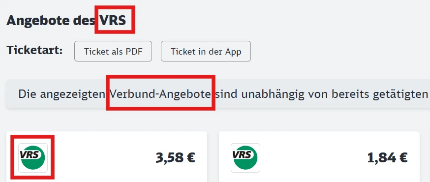 Als grobe Orientierung kann auch im DB Navigator oder der Website der DBgeprüft werden, ob für eine Strecke Verbundtickets verkauft werden. Diese sind als Verbund-Angebote, mit dem Logo und unter Angebote des [Verkehsverbundnamen] gekennzeichnet.